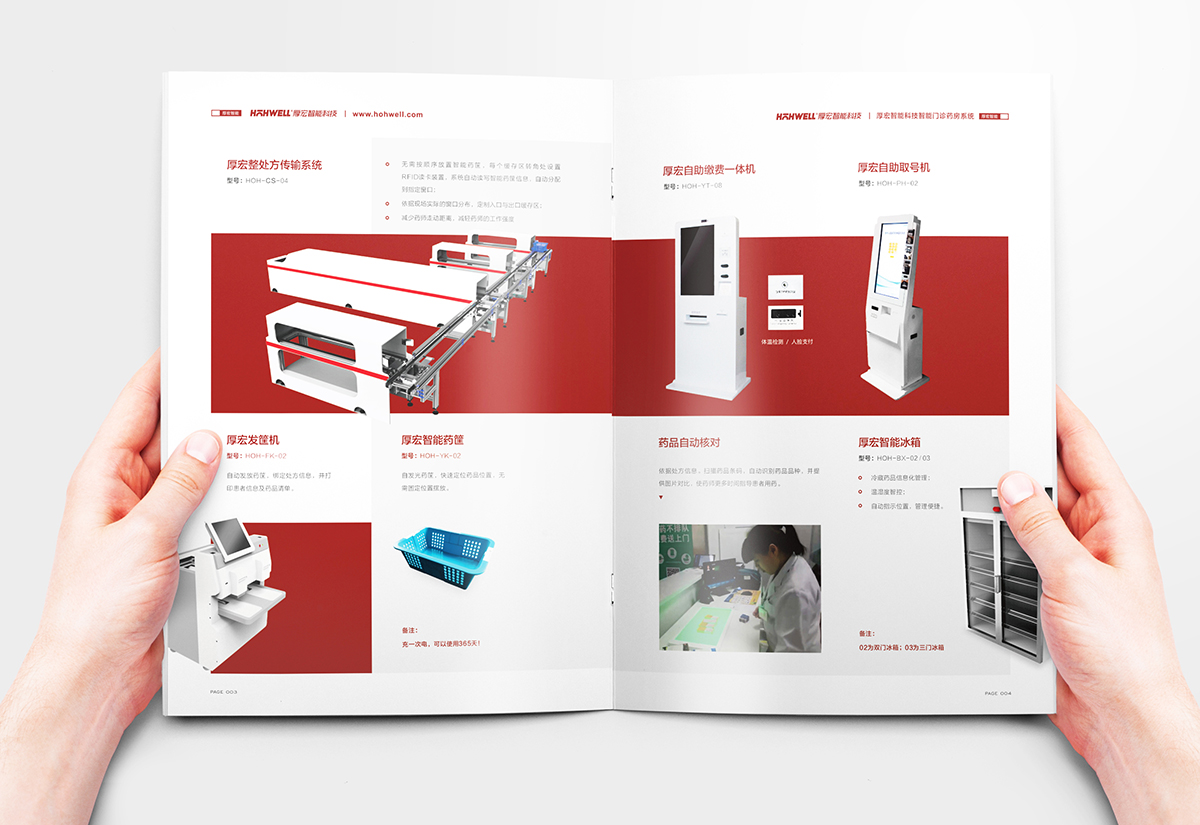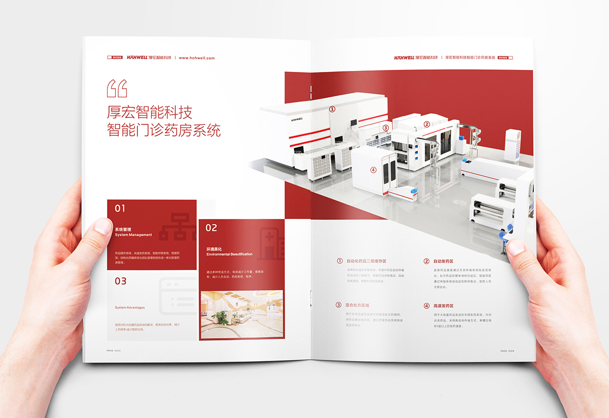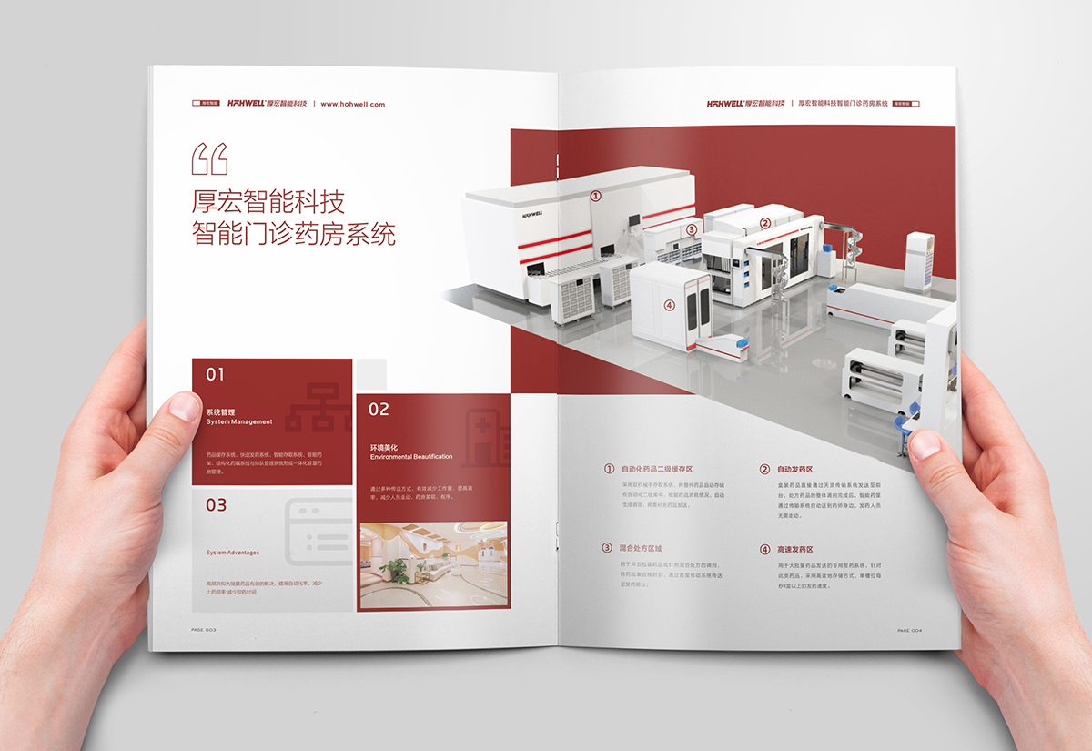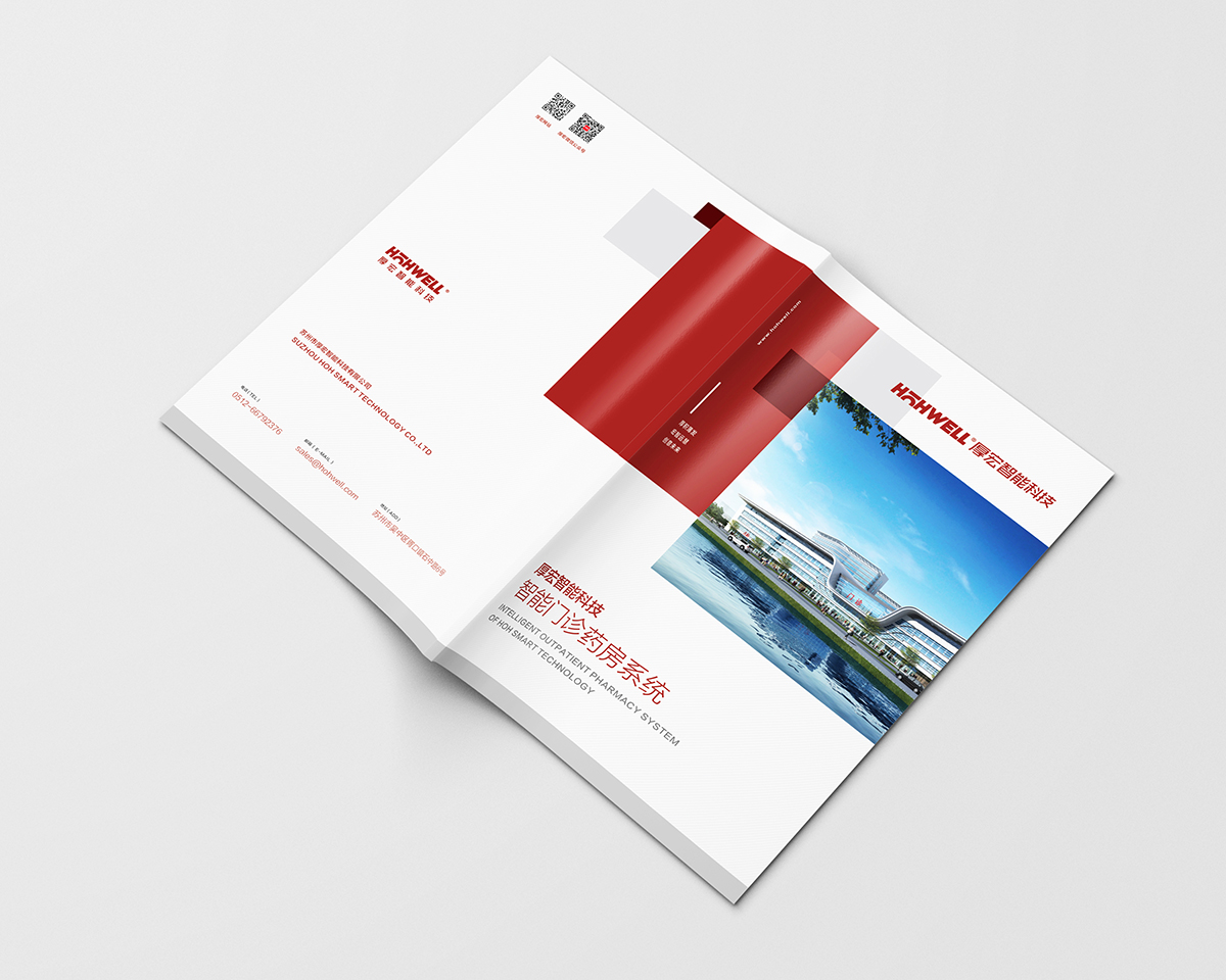 厚宏智能科技門診藥房系統宣傳畫冊設計,厚宏智能坐落于古典與時尚并存的蘇州,是一家智慧一體設備及解決方案的供應商,主要專注醫療服務體系相關自動化的設備領域,涵蓋智慧藥房服務管理站,智慧前段服務管理站,智慧靜脈配送中心等項目,構建一體化的醫療機構服務體系。