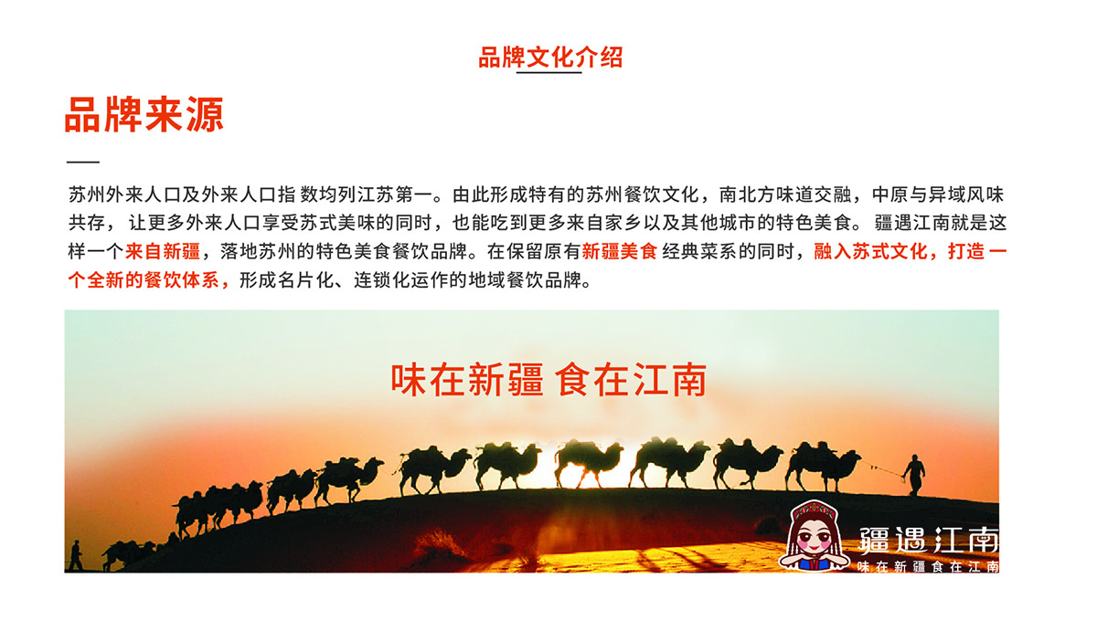 品牌介紹:疆遇江南本著“味在新疆,食在江南”的經營原則,始終如一把新疆最美、最本真的味道原汁原味的帶到江南,深度開發小食精品新疆餐,涵括疆內各類特色美食、民族小吃,把新疆味道與江南餐食文化相融合,只做“味美、健康、精致” 的南方新疆小食餐,把“味合,即和”的品牌理念融入生活的一日三餐。