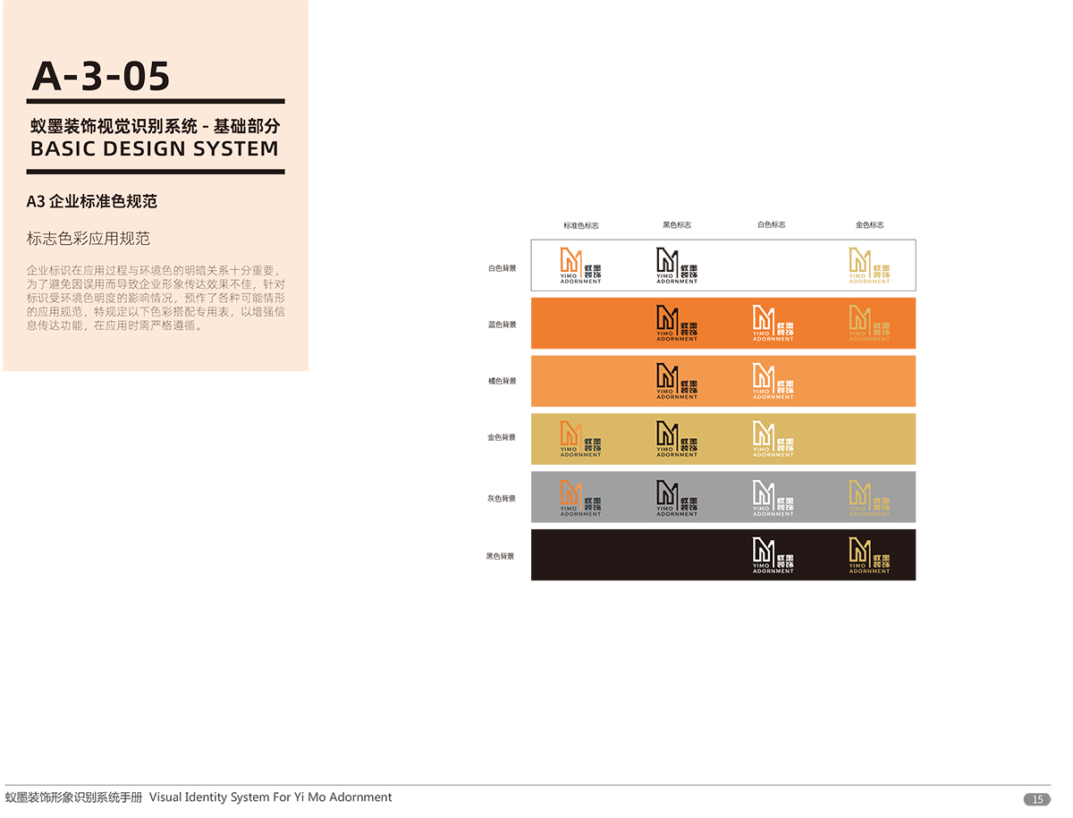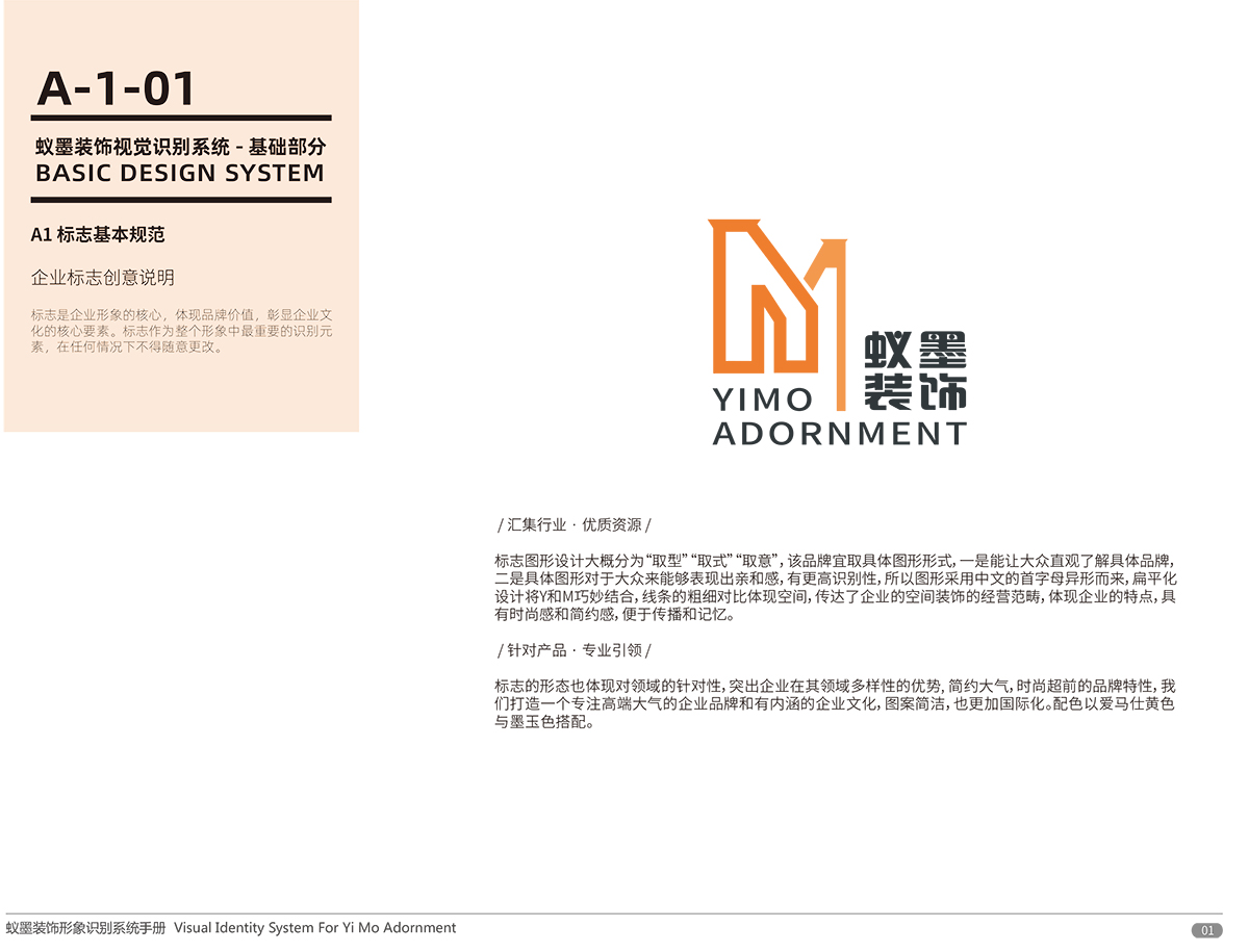 品牌介紹 :蘇州蟻墨裝飾工程有限公司經(jīng)營范圍包括室內(nèi)外裝飾裝潢工程、建筑工程、幕墻工程、園林綠化工程、樓宇智能化工程的設(shè)計與施工;管道、門窗、水電安裝;銷售:建筑材料、金屬材料、五金交電。LOGO設(shè)計,選用“YIMO”的首字母“Y,M”進(jìn)行圖形創(chuàng)意,設(shè)計簡潔、配色以愛馬仕黃色與墨玉色搭配,偏平話設(shè)計講字母巧妙的組合在一起,通過線條的粗細(xì)突出層次感和空間感,傳達(dá)了企業(yè)的空間裝飾理念,易于傳播與記憶。