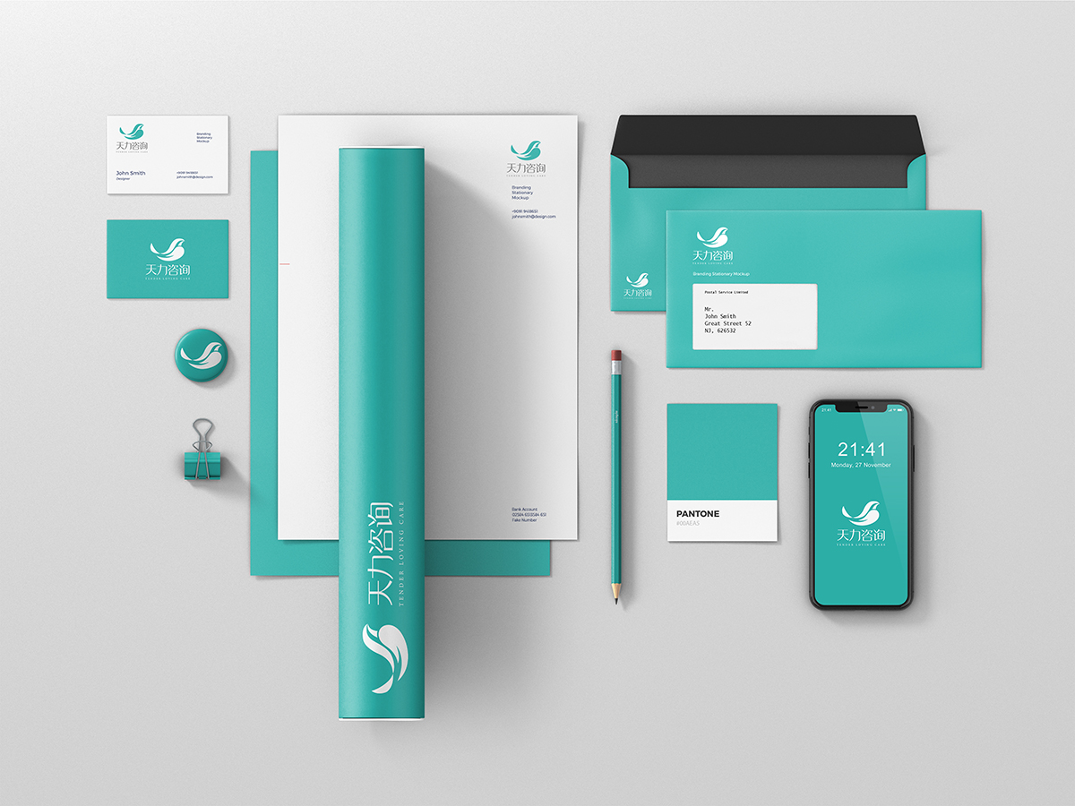 天力咨詢logo以標(biāo)志以飛鳥與手為靈感,同構(gòu)圖形拼搭具有設(shè)計感,以此來延伸設(shè)計。“飛鳥”代表我們奮斗的目標(biāo)和高度;“手”代表我們友好的態(tài)度和親切的關(guān)懷;藍綠色的logo代表我們做事的態(tài)度和心態(tài),與“天”的屬性相契合。整個logo切合“天力”的理念:自由飛翔的從容,發(fā)自內(nèi)心的關(guān)懷,由淺入深,精益求精,追求卓越!Logo顏色以藍綠色為主調(diào),沉穩(wěn)與輕靈并重,代表了企業(yè)高尚、端莊、充滿個性的工作品質(zhì)。