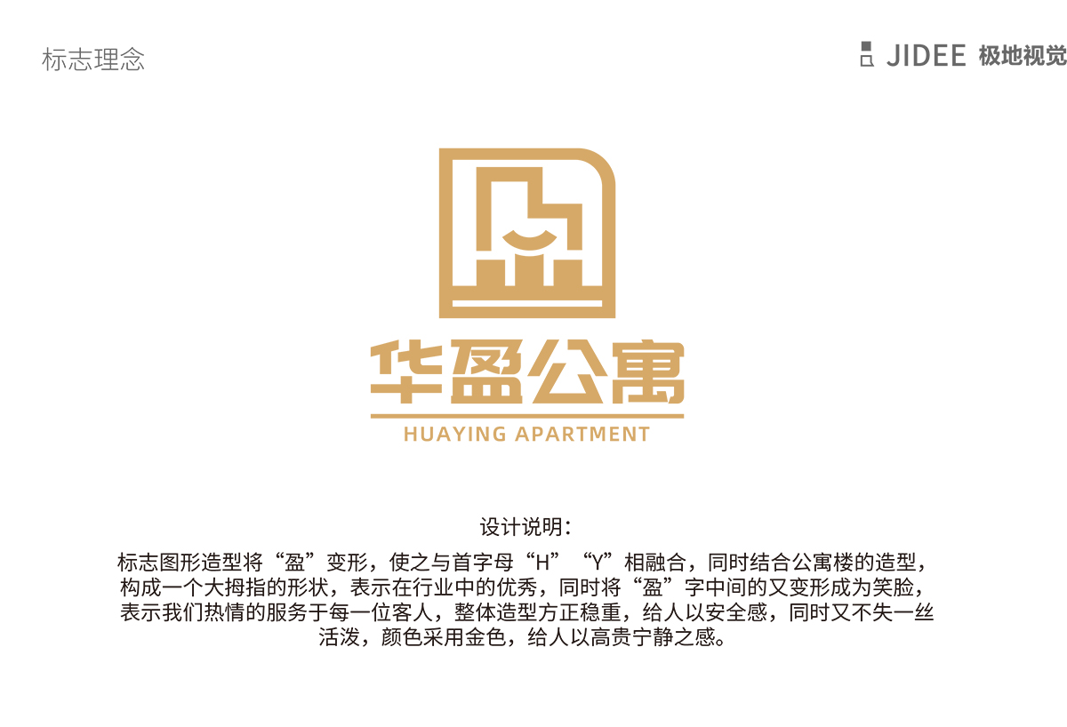 品牌介紹 :華盈公寓logo設計,標志圖形造型將“盈”變形,使之與首字母“H”“Y”相融合,同時結合公寓樓的造型,構成一個大拇指的形狀,表示在行業中的優秀,同時將“盈”字中間的又變形成為笑臉,表示我們熱情的服務于每一位客人,整體造型方正穩重,給人以安全感,同時又不失一絲活潑,顏色采用金色,給人以高貴寧靜之感。