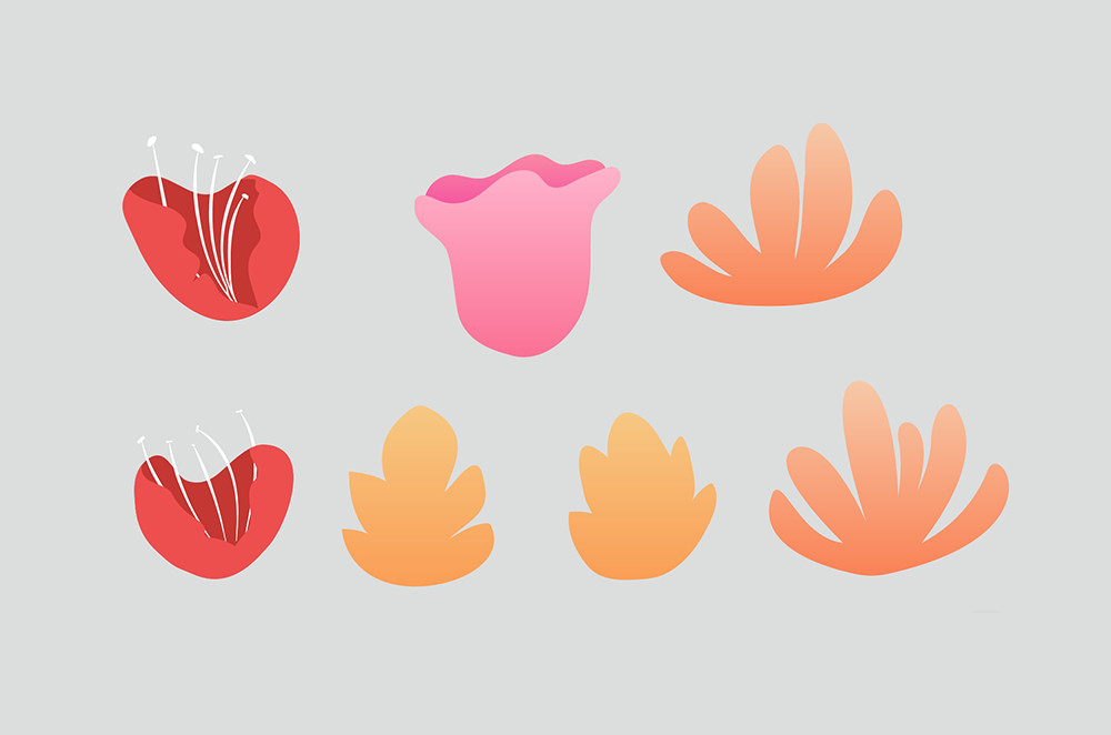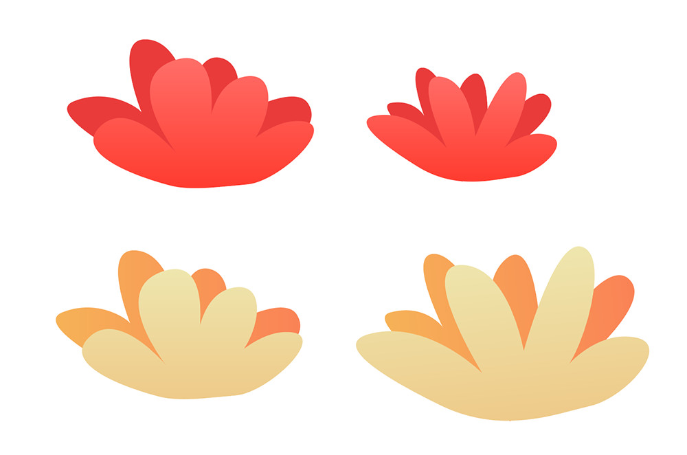 再來增加不同的花朵造型,上兩步是花朵的正面,現在來繪制花朵的側面造型。側面造型的填色為橙紅色與黃色。在屬于花朵“背面”的部分填色要深一些。這樣就能帶出一定的空間感。填色時注意色彩上的微妙的漸變。