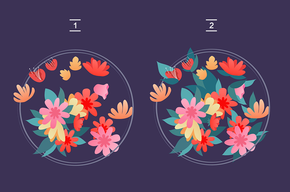 將我們所準備好的素材花朵,一朵一朵進行布局的安排。目的是平衡的填充這塊圓形區域。在這一過程中,大家的心中要有一個所謂的層次觀,也就是對于花朵的空間層次要有非常清晰的規劃,而這兩個圓在層次空間一個位于最上層,一個位于最下層。這樣就能更好的強調出空間關系。