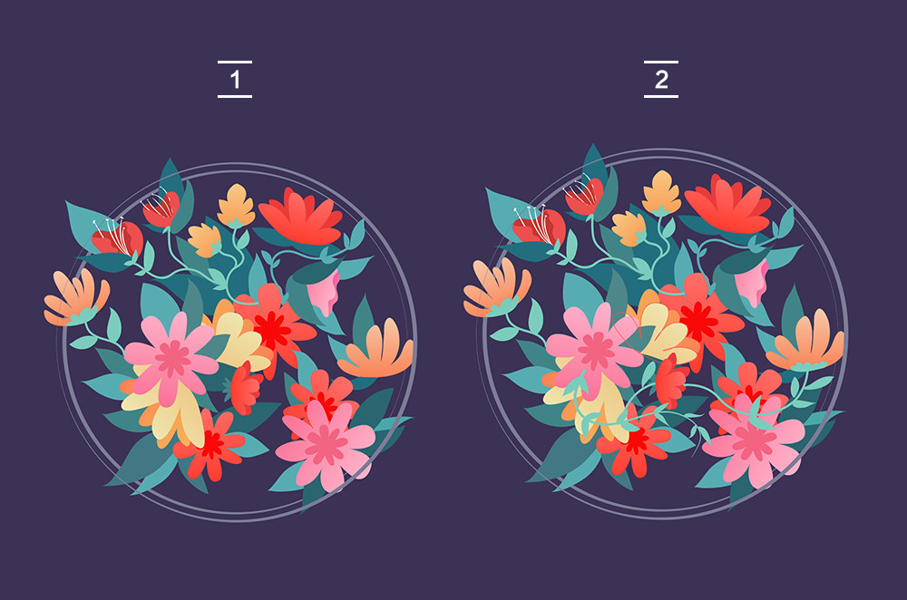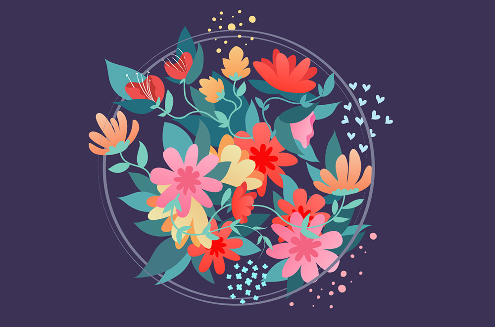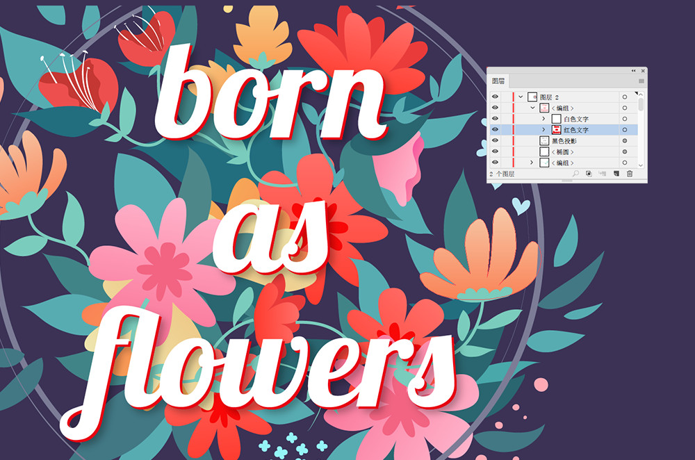 嵌入文字可以說也是一項很繁瑣的工序,你需要把文字對象不斷來回拆分重組,利用層次關系甚至是形狀生成工具進行細微的調整。總的來說,你要讓整個畫面看上去“合理”。文字遮擋的部分隱沒于花束中,空間上的層次要分明。