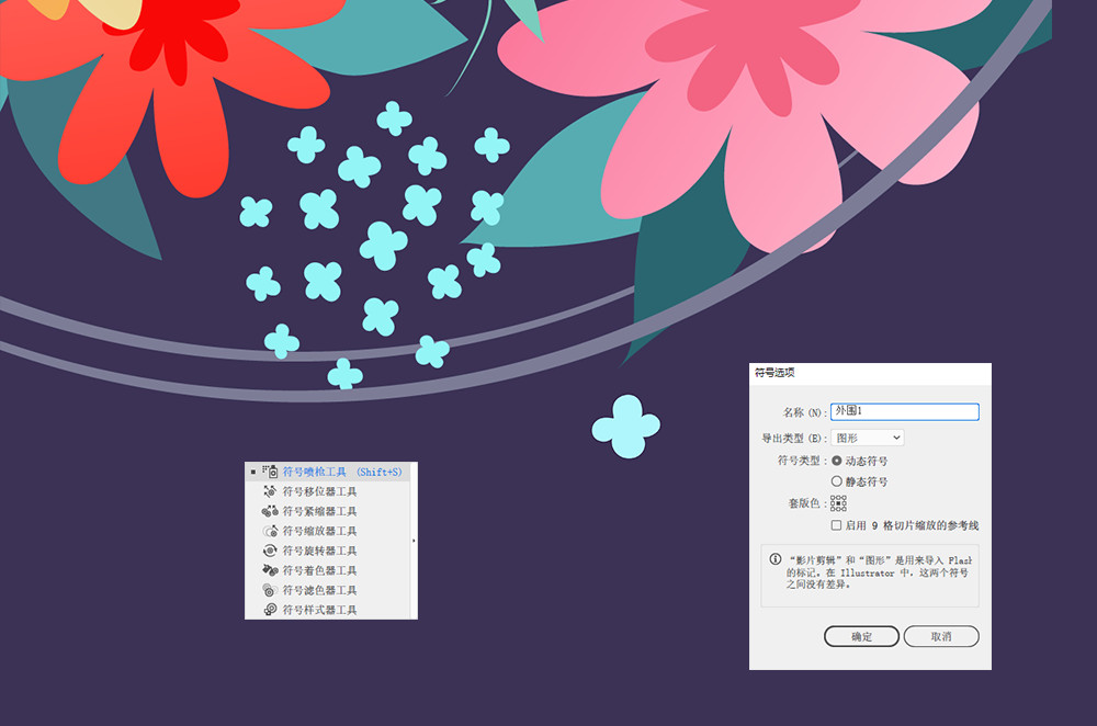 讓我們利用符號工具來繪制第一個外圍細節——散落的藍色小花。先利用鉛筆工具繪制出一朵淺藍色的花朵,這是一個非常簡單的造型。將這個圖案拖入到“符號”面板中,將彈出一個新增符號的參數選項框,設置好相應的參數,點擊確定后,就可以利用工具欄中的“符號噴槍工具”在相應的位置進行“涂抹”繪制。可以看到符號噴槍工具下方的一系列“移位”“縮放”“旋轉”等工具都能群體操作這一組所繪制的符號,要讓最終效果表現自然,你不能讓這些花朵都呈現出完全相似的樣子。