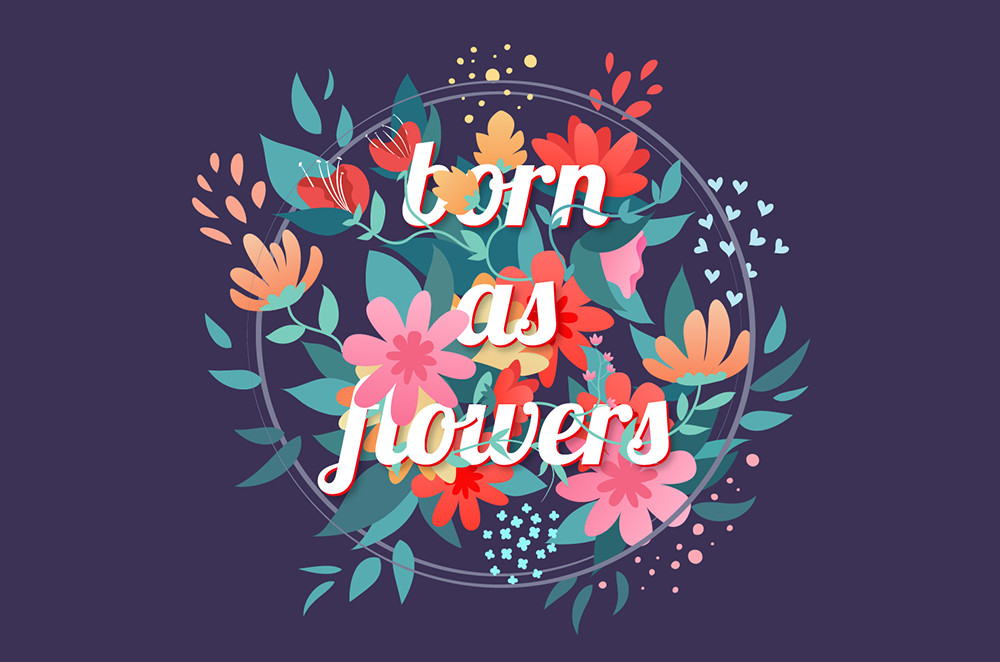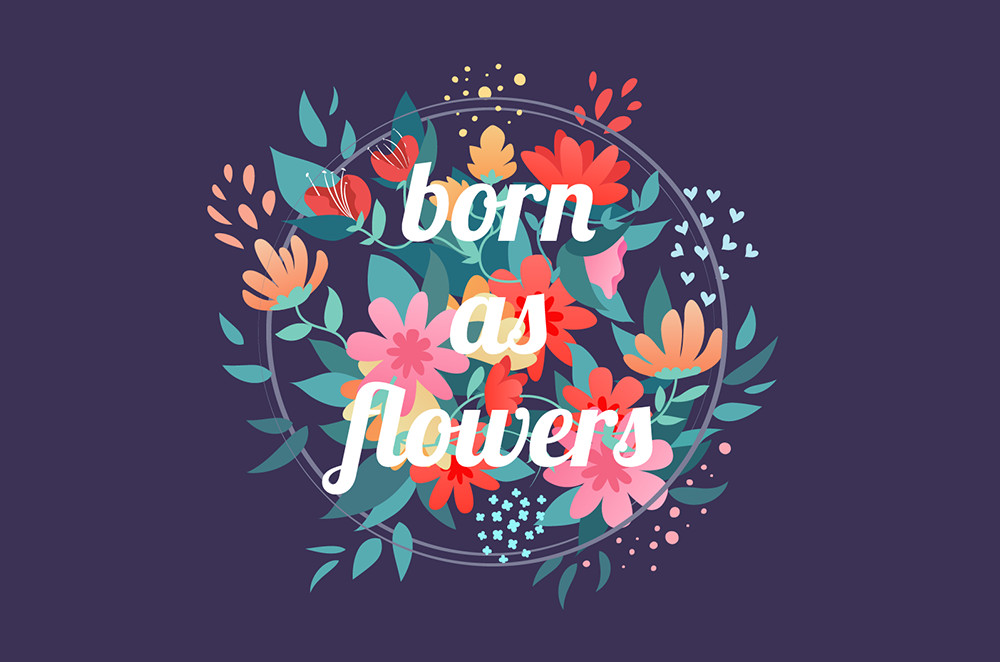 先用文字工具寫出“born as flowers”的文字,排列成為三行,并居中顯示。字體我運用的Lobster,連體字形更能很好的和藤蔓的外形關系結合起來。