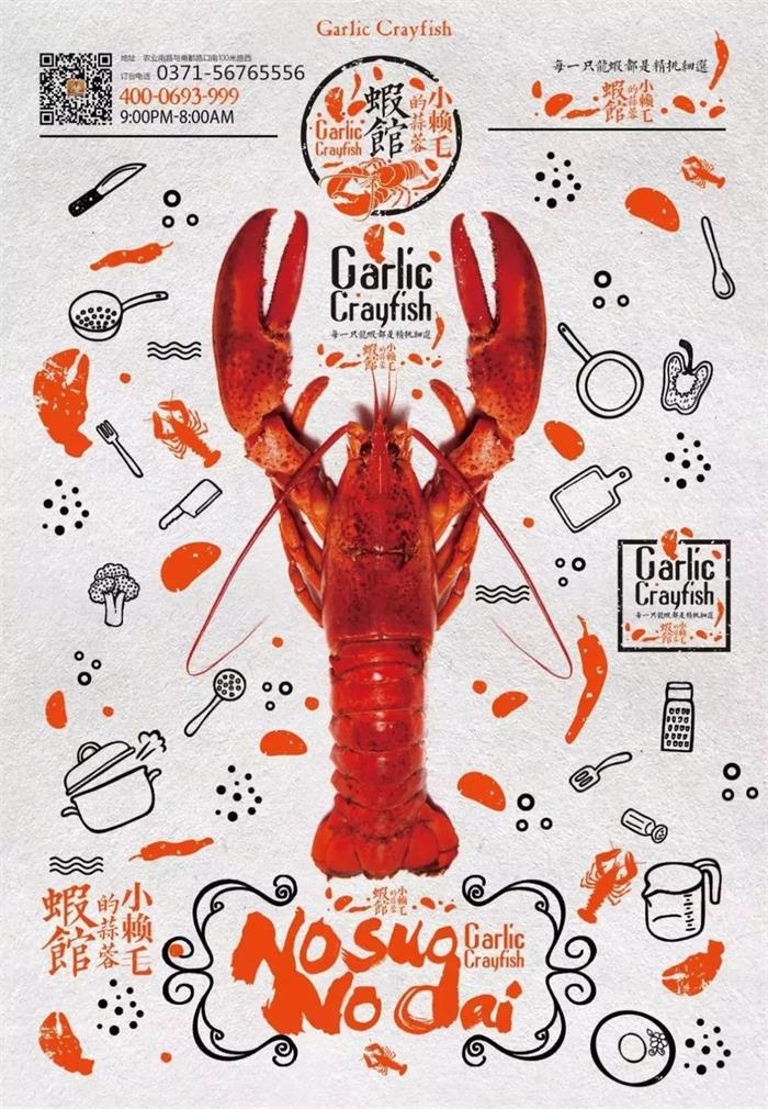 小賴毛的蒜蓉蝦館采用濃厚的色彩來,表現(xiàn)海鮮的鮮與兇猛,大膽的紅白黑撞色能從感官上刺激食欲,手繪圖案搭配兇猛小龍蝦,手繪風(fēng)與寫實(shí)風(fēng)的碰撞帶來強(qiáng)烈的視覺效果。以眾多細(xì)小的廚房用品為輔助圖形,細(xì)節(jié)感與層次感up up up,涂鴉風(fēng)格的應(yīng)用很年輕時(shí)尚。