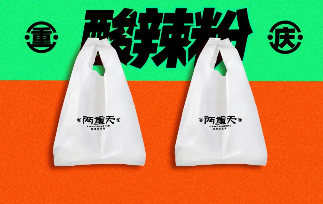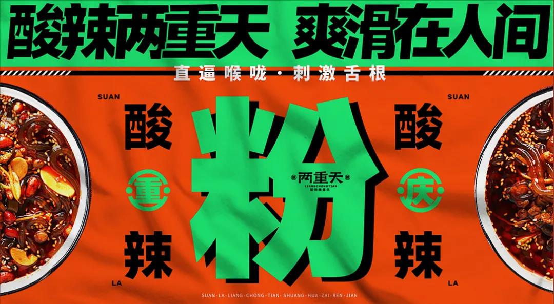 這個(gè)酸辣粉的品牌LOGO,是簡(jiǎn)潔的幾個(gè)字體組成,用排版順序的重次增加視覺(jué)效果。而Slogan“酸辣兩重天,爽滑在人間”,表層字眼的文案,有著“簡(jiǎn)單粗暴”的勁爽。