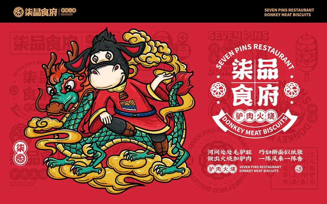 品牌根據(jù)品類塑造了一個(gè)驢IP,擬人化處理后的驢IP,形態(tài)更接近Q版,兩只驢耳朵向外伸展,隨著表情動(dòng)作向上或向下伸展,很是靈動(dòng)。傳統(tǒng)服飾在身,對(duì)驢肉火燒的歷史悠久進(jìn)行不經(jīng)意的刻畫。驢IP拿著不同的東西做出不同的動(dòng)作時(shí),形象就變得年輕起來(lái)了,十分有趣。驢IP與青龍、鯉魚、嫩豬以及小雞等具有中式代表性的動(dòng)物進(jìn)行搭配,創(chuàng)作出一幅幅國(guó)潮風(fēng)插畫,是對(duì)美好寓意的向往和憧憬,也突出品牌的包容性和多樣性特點(diǎn)。品牌的輔助圖形就比較常見了,從標(biāo)志和IP中延展,與文案和簡(jiǎn)筆食材、菜品結(jié)合,以此更好的宣傳柒品食府這個(gè)品牌。
