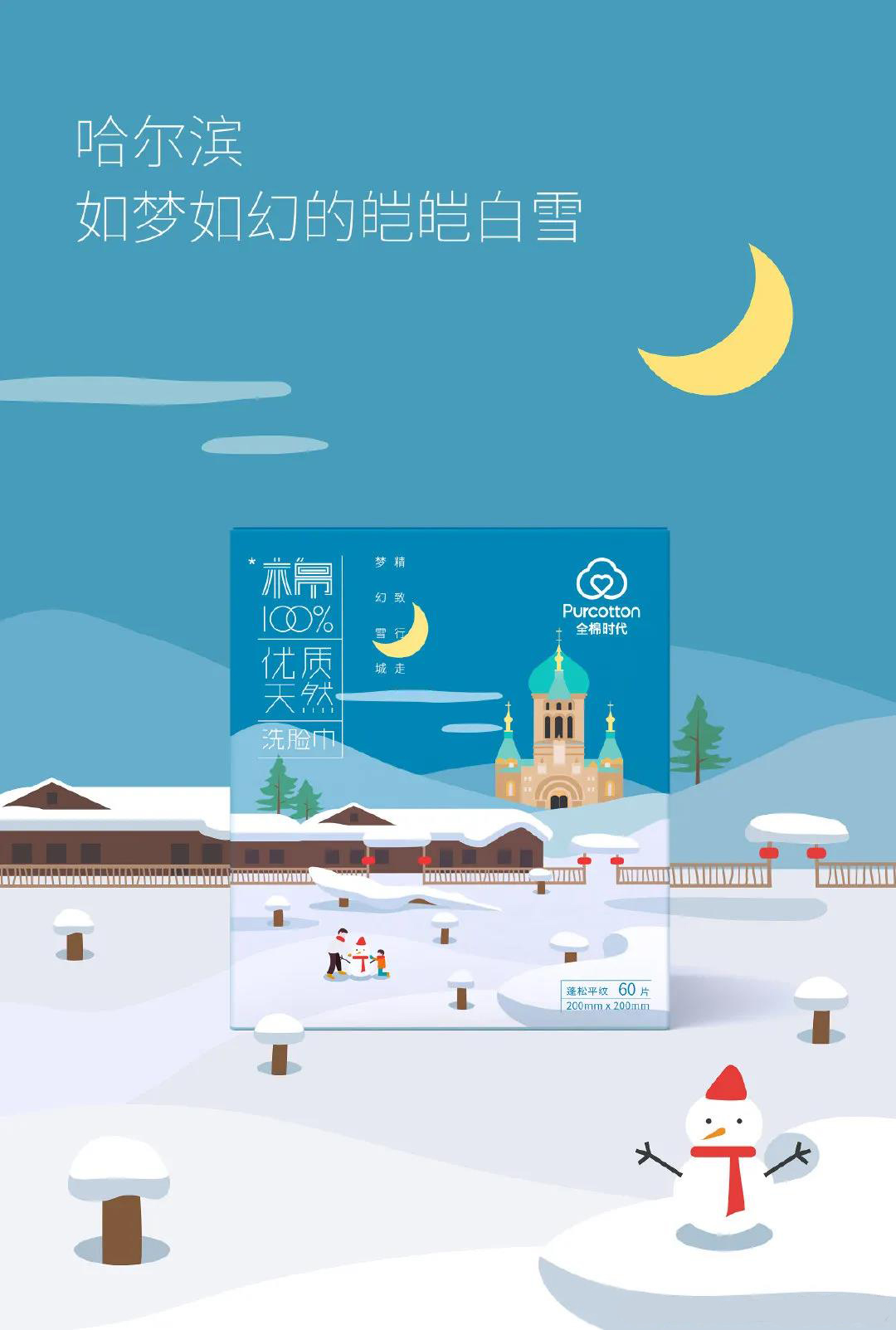 包裝延續(xù)品牌小清新的設(shè)計(jì)風(fēng)格,結(jié)合四季色調(diào)的畫(huà)面呈現(xiàn),描繪了布達(dá)拉宮、貴州梯田,以及敦煌石窟、東北雪鄉(xiāng)四大經(jīng)典美景,進(jìn)而拉近與消費(fèi)者的情感距離。側(cè)面包裝還印有整齊排列的棉花元素,使得畫(huà)面更加充盈的同時(shí)表明了產(chǎn)品的品牌調(diào)性,視覺(jué)上也更顯溫柔、細(xì)膩。