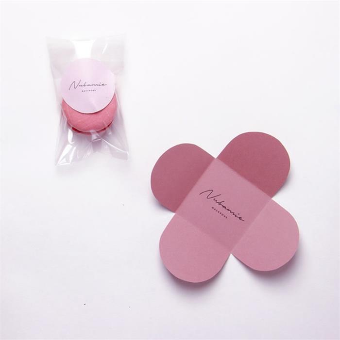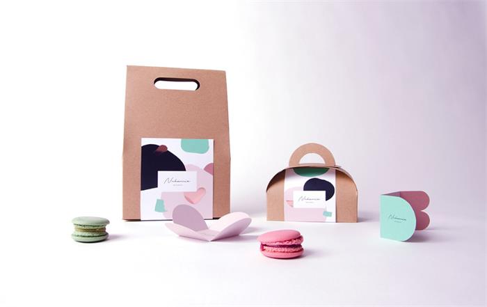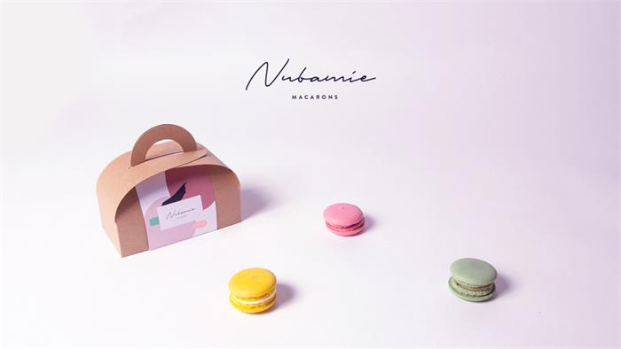 品牌選用牛皮紙色調(diào)的紙盒包裝,中間插入粉嫩的插畫設(shè)計,小小的半弧圓環(huán)精致且方便攜帶。盒子內(nèi)的馬卡龍?zhí)鹌芬灿袉为毜目埌b,形狀展開如同花瓣,每個都有獨立包裝,這樣也方便貯藏及防潮。
