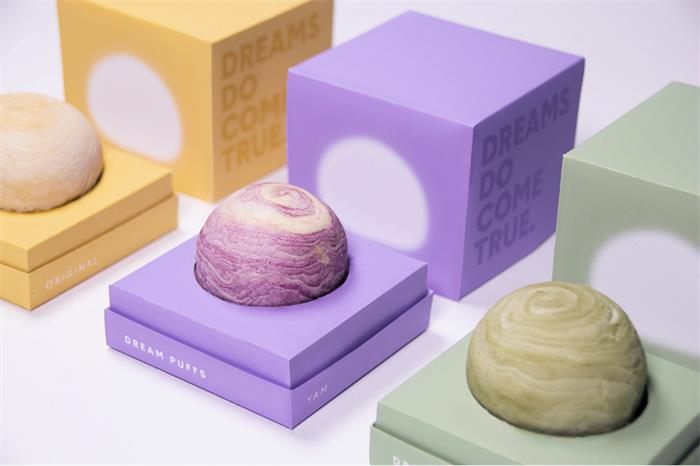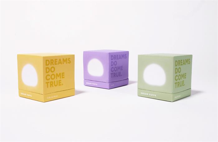 該品牌推出的是一套具有三種風味的芋頭糕點——山藥、馬卡和原芋頭。這是一種面向西方市場的亞洲糕點.做夢泡芙不僅是為了制作美味的糕點,還可以為日常生活創(chuàng)造一種令人驚奇和愉快的品嘗體驗。通過運用與三種食物口味相關(guān)的明亮色彩和簡單的字體設(shè)計,激發(fā)了觀眾的好奇心和想象力,模糊的插圖描繪了煙團的形狀,但沒有完全告訴他們里面到底是什么。品牌制作的目的是當觀眾打開盒子時,驚訝于這種精致的美麗圖案,它與品牌“夢想成真”的口號相匹配,包裝的結(jié)構(gòu)經(jīng)過精心設(shè)計,以最佳方式呈現(xiàn)出泡泡。