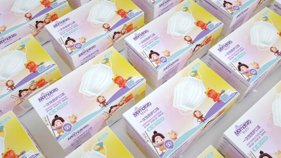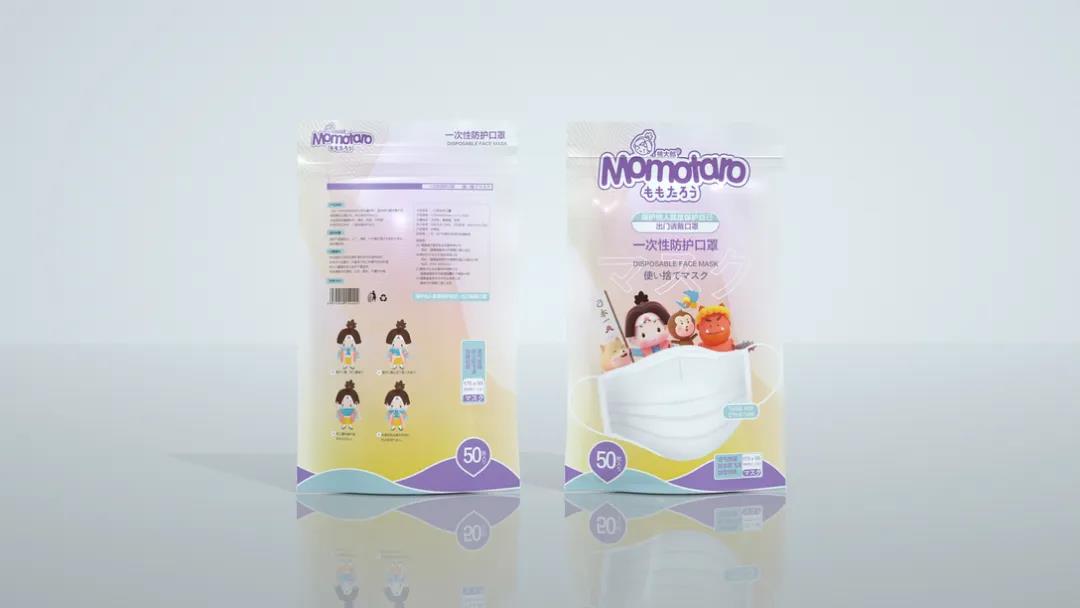日式風(fēng)格的口罩包裝,插畫IP靈感來自于日本五大童話之首《桃太郎》,生動勾畫出五個主要動畫形象,街知巷聞的故事性場景貼近生活。