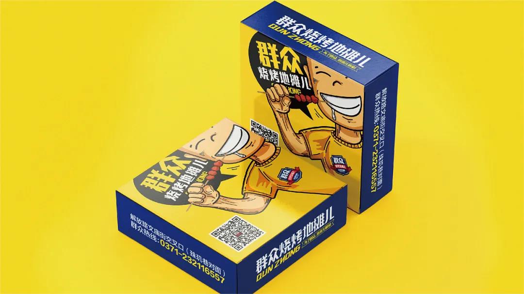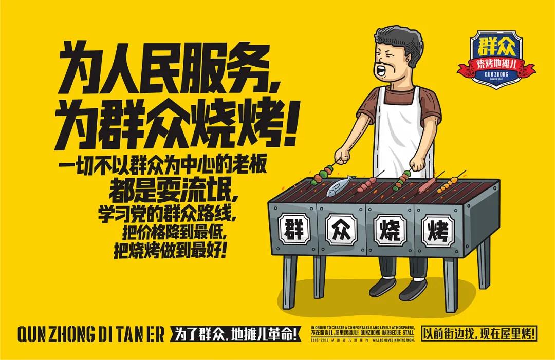 這個燒烤品牌是基于群眾的定位而進行命名的,群眾燒烤地攤兒,既表明品牌是面向大眾的、百姓的,在價格上也是親民的,同時又體現街頭市井文化,突出燒烤品類接地氣的品類屬性。品牌的LOGO標志采用了徽章式圖標,徽章與盾牌符號相結合,體現食品的安全性;紅旗飄帶體現革命屬性,也象征著只是一次燒烤改革;群眾二字格外顯眼,強調品牌的大眾親民,這些元素重新組合,構成超級圖標。
