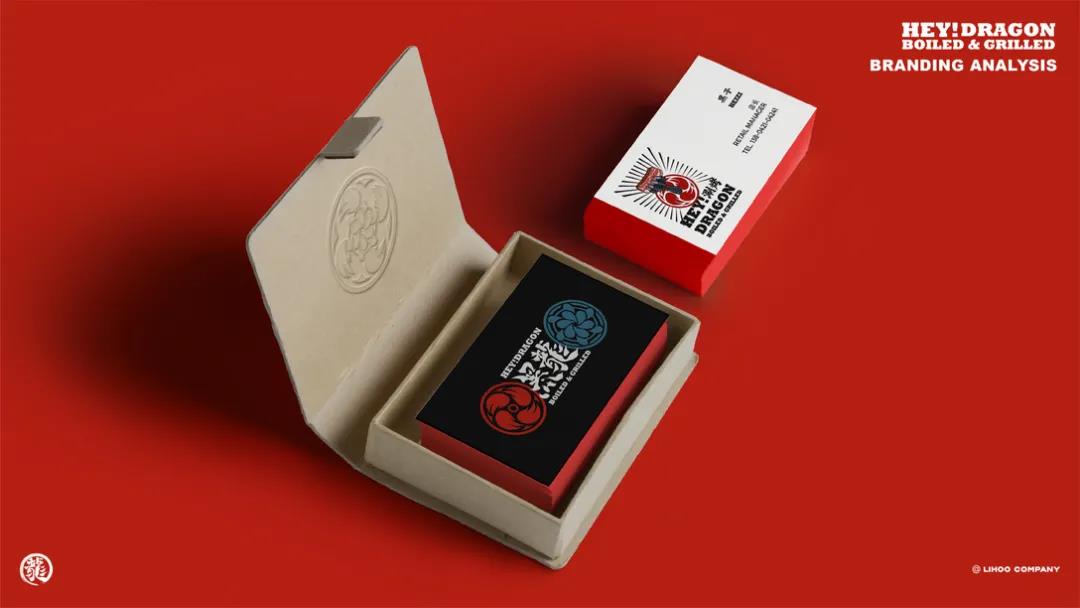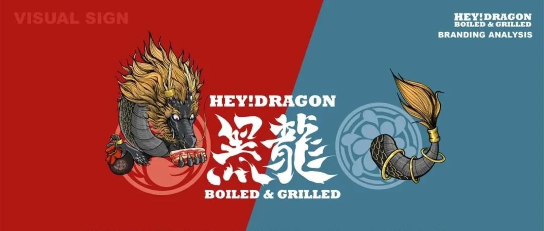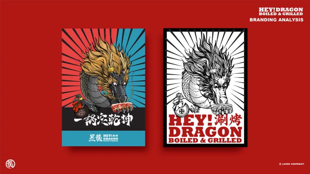 創新重構視覺表達,設計表達不是純傳統呈現,而是根據原有的圖騰再去創新演繹,讓整體風格更符合都市人群的喜好。且可以明顯發現,整條龍是不連貫的,龍身體的中間部分要么通過字體來補充,要么直接被隱藏,這就和其他的使用龍元素的品牌有了一定的差異。黑龍的輔助延展圖形結合了LOGO、廣告語、IP以及特色涮烤鍋等,不同形式的組合方式,豐滿了整個品牌形象。