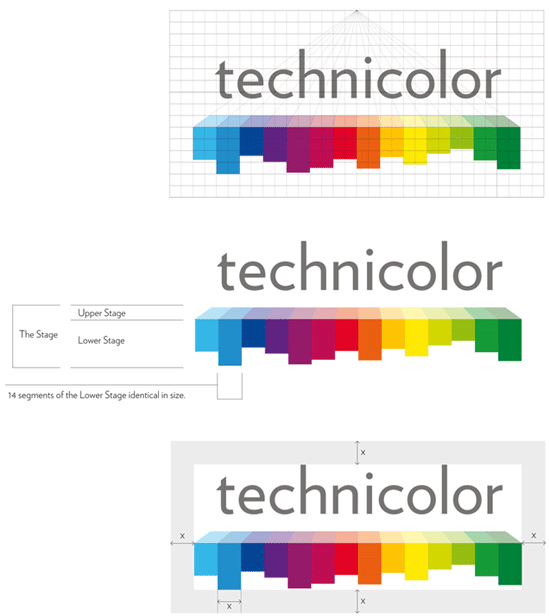 可惜我手頭上沒有他們印刷品(如名片)來觀看印刷效果,因為我想看看這是不是又是一個“僅在電腦中好看”的標志。十四種顏色(實際上是二十八種,因為所謂的 “上方舞臺”及“下方舞臺”的顏色還有輕微區別)用在一個標志上,我不知道會不會讓四色印刷的那些師傅或者在中國常用的那種名片機印刷的那個調色的師傅在暗中叫苦。這個標志構思就是要通過光譜來營造一個“色彩舞臺”,在上圖中的透視消失點示意圖中既代表各個顏色塊的輪廓位置,也表示一個光源。