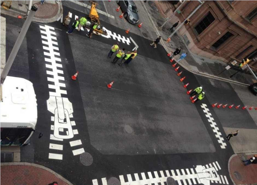 另外一位藝術家Graham Coreil-Allen,將小時候游戲跳格子的概念融入斑馬線中,并加入當地的城市歷史意涵。