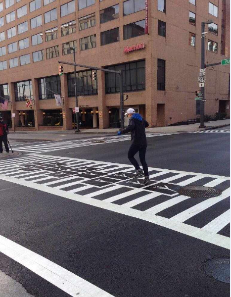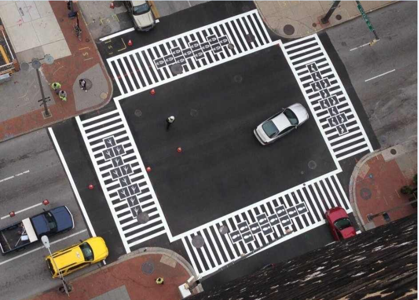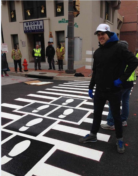 在美國巴爾的摩,為了增加公共藝術的能見度,便邀請了幾位藝術家進行行人斑馬線的藝術創作,讓人們在忙碌生活中低頭疾行的同時,也能在腳下感到一絲不一樣的驚喜創意和屬于城市的藝術