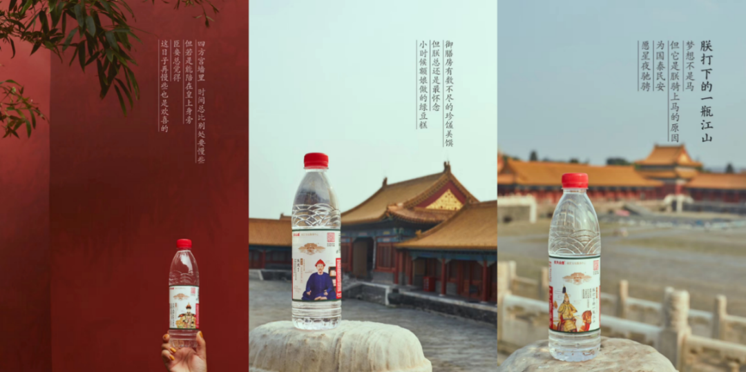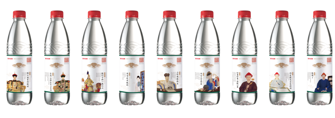 比如農(nóng)夫山泉攜手故宮文化服務(wù)中心聯(lián)合跨界合作,推出9款限量版“農(nóng)夫山泉故宮瓶”。以瓶身為載體,用康雍乾三代帝王,以及后妃們的人物畫像為設(shè)計(jì)主體,結(jié)合畫面人物性格,配以娛樂社交的文案,利用宮廷情節(jié)作為創(chuàng)意點(diǎn)來推廣產(chǎn)品。