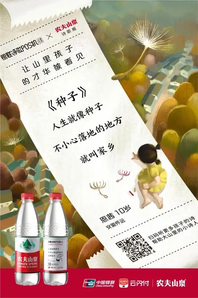 還有最近農(nóng)夫山泉推出的“詩歌瓶”,把來自四川、安徽、河南山區(qū)兒童寫的24首詩歌印制在了瓶身上。有童心對(duì)大自然充滿想象力的洞察和淳樸,也有來自留守兒童的心酸,掃碼可以聽到大山的孩子讀詩,也可前往銀聯(lián)云閃付進(jìn)行助力捐贈(zèng)。不僅樹立了品牌形象,也把大家的目光引向了大山深處,讓更多人關(guān)注到鄉(xiāng)村留守兒童,讓山里孩子的才華能被更多的人看見。