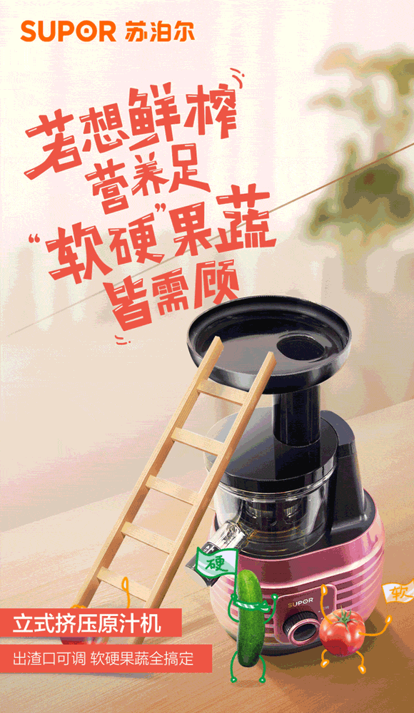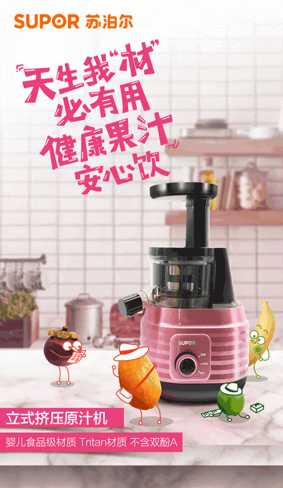 多吃果蔬對身體有益。也許購買一臺榨汁機,DIY美味又營養的果蔬汁是最好的選擇。蘇泊爾用一套萌萌的水果人GIF,消除人們對果蔬機在營養保留、口感以及材料的安全性上的擔憂,遇見最好的自己,從鮮活果蔬汁開始。