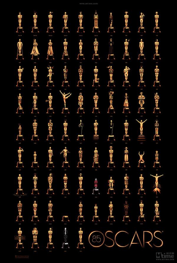 就算你是個瞧不上奧斯卡學院獎的人,你也會愛死畫家奧利·摩斯為第85屆奧斯卡設計的官方海報的。盡管早前就有很多人為奧斯卡最佳影片做過藝術海報的設計,但奧利·摩斯用一張海報涵蓋了85年來所有人的工作,這張海報上的85座小金人分別代表85年來的學院獎最佳影片,奧利·摩斯用極端簡約的元素,雕刻了每一年奧斯卡時光,和那些最佳影片。
