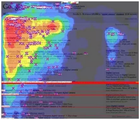 在谷歌搜索頁(yè)面,前五個(gè)搜索結(jié)果獲得的“眼球”最多。紅線代表你必須滾動(dòng)鼠標(biāo)翻頁(yè)了。