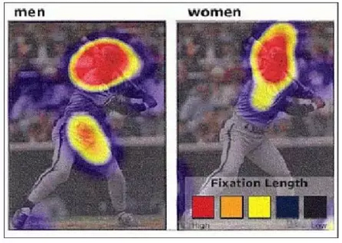 看棒球比賽,男人看棒球運(yùn)動(dòng)員的臉和身體,而女人只看臉。