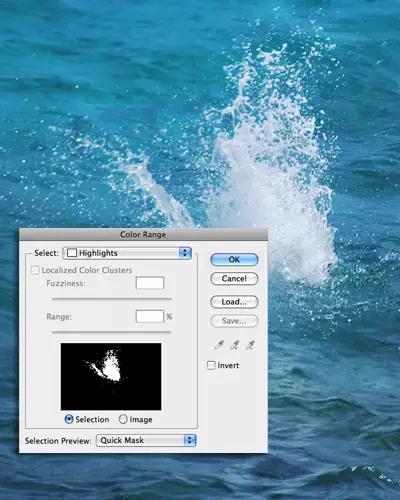 選擇> 顏色范圍,利用顏色拾取器單擊對象。在這個例子中,我單擊的是水浪的白色區域。