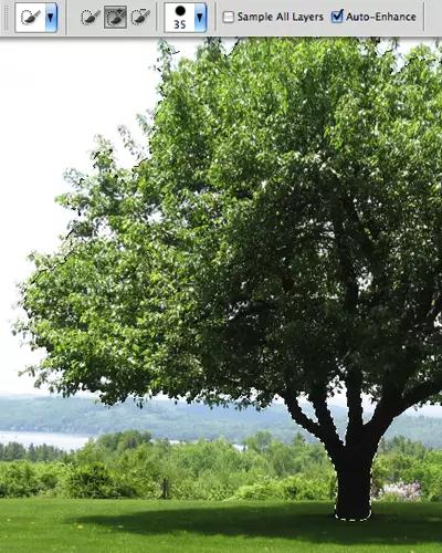 接下來,使用細化邊緣工具沿著選區的邊緣進行描繪。對于樹葉部分可選用大尺寸畫筆,而有明顯輪廓邊緣的樹干部分選用較小的畫筆。還可以移動調整邊緣滑塊對邊緣進行光滑、羽化或硬化處理。