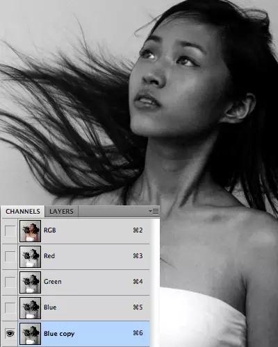 點擊每一個圖層,找出圖層背景和頭發部分顏色差異最大的圖層。然后,復制該圖層。