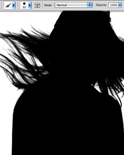 接著,使用一個黑色的畫筆補全模特身體的其他部分,白色畫筆用于描繪背景中的暗色區域。