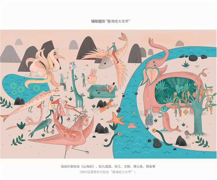 膳海經VI設計,該零食品牌面向年輕群體,為了迎合年輕人的喜好,采用插畫的設計形式進行包裝設計!吧藕=洿笫澜纭笔墙柚胶=浀男蜗筮M行創作,想要展示一個不受世俗約束的樂園,同時,顯現出膳海經食材豐富,山珍海味無奇不有。標志整體形態由圖文組成,圖的形態由輔助圖形中的動物與植物圖形組成,展現一副生機勃勃的景象,強調品牌是原生態、純天然的綠色食品。文字由品牌名“膳海經”組成,線條簡約,兼具現代時尚感和中國風韻。傳遞品牌立足現代,傳承傳統文化的品牌宗旨。