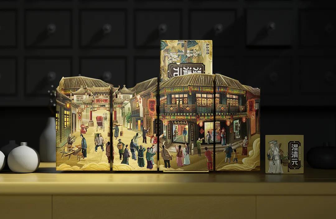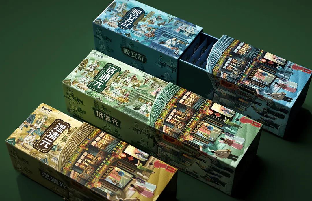 外盒包裝以藥都里仁街為背景,提煉里仁街、中醫(yī)館及華佗等的代表元素,構(gòu)建一個(gè)傳統(tǒng)中醫(yī)館的形象,特定場(chǎng)景的畫(huà)面布局體現(xiàn)了華佗的養(yǎng)生茶工藝,進(jìn)一步塑造產(chǎn)品關(guān)聯(lián)性。同時(shí)為了區(qū)分養(yǎng)生茶品類,外觀采用三種清雅古韻的性質(zhì)用色,結(jié)合立體感十足的插畫(huà),將元素融合成獨(dú)特的有文化承載的視覺(jué)符號(hào),打造一款差異化的養(yǎng)生茶產(chǎn)品形象。