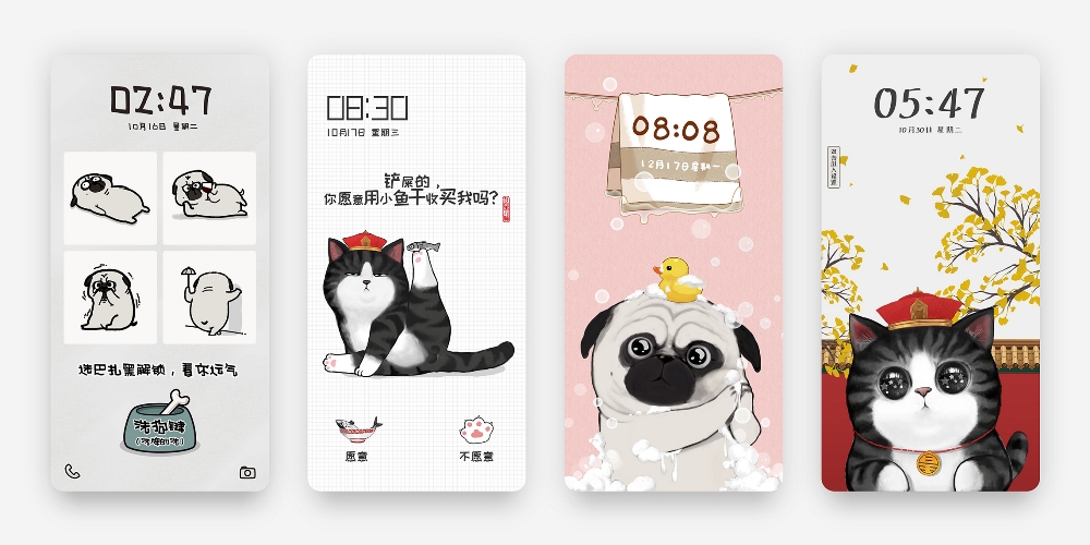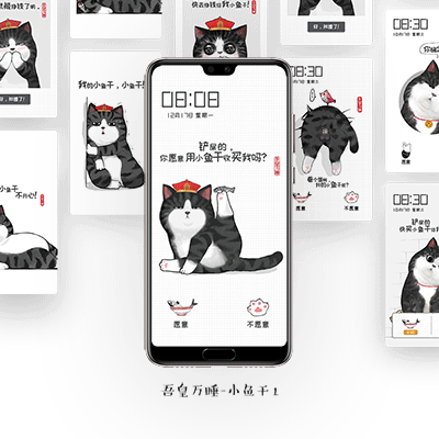 手機主題有趣的地方就在于,不同于靜態(tài)的壁紙,主題是動態(tài)且可以交互的。《小魚干》的沉浸式交互設(shè)計,受到粉絲的一致好評。這款主題以喂吾皇小魚干的第一人稱視角,讓用戶主動選擇喂或不喂,打造了一次新奇的互動旅程。如果用戶選擇不同意喂小魚干,吾皇就傲嬌黑屏,讓你沒有一點防備。若用戶選擇同意,吾皇會人性化引導(dǎo)用戶不斷地摸蛋蛋去掙錢,讓手機屏幕也能體驗一把闖關(guān)游戲的樂趣。